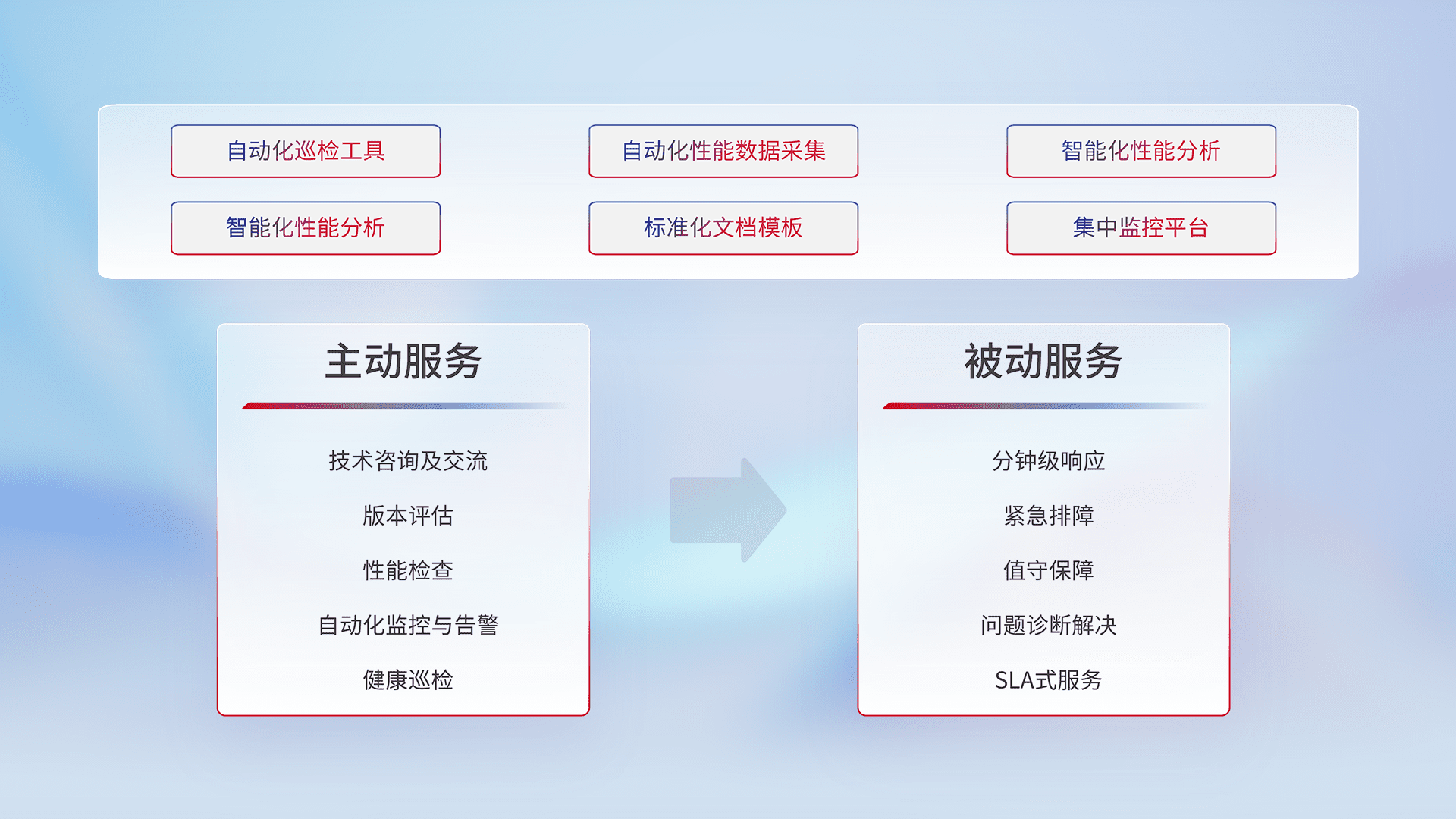 智能化工具和标准化文档,,,,保障服务质量,,,提供主动服务(包含技术咨询、、、版本评估、、、、性能检查、、、自动化监控与告警、、健康巡检)和被动服务包含(分钟级响应、、、、紧急排障、、、值守保障、、、问题诊断解决、、、、SLA服务)。。